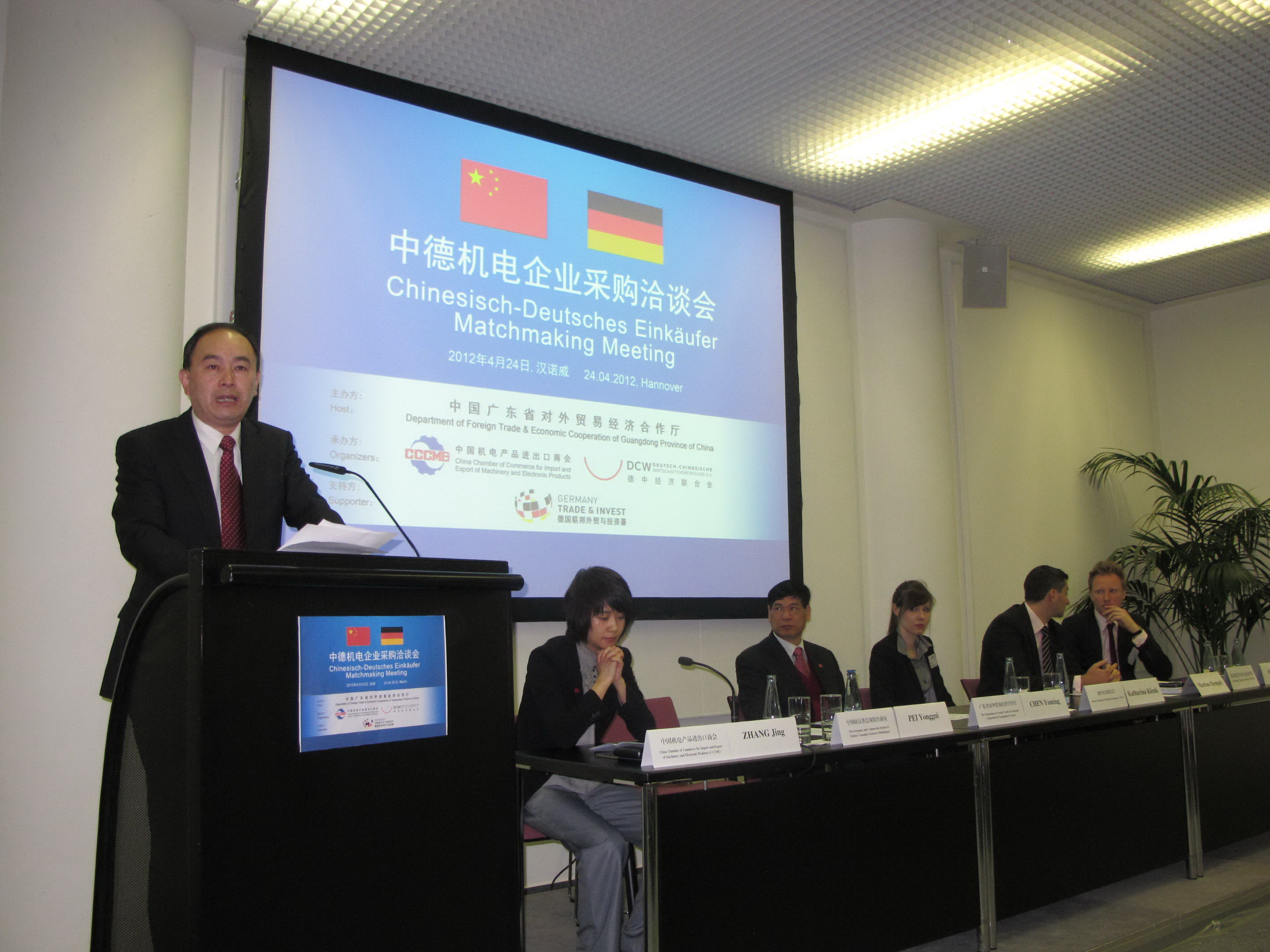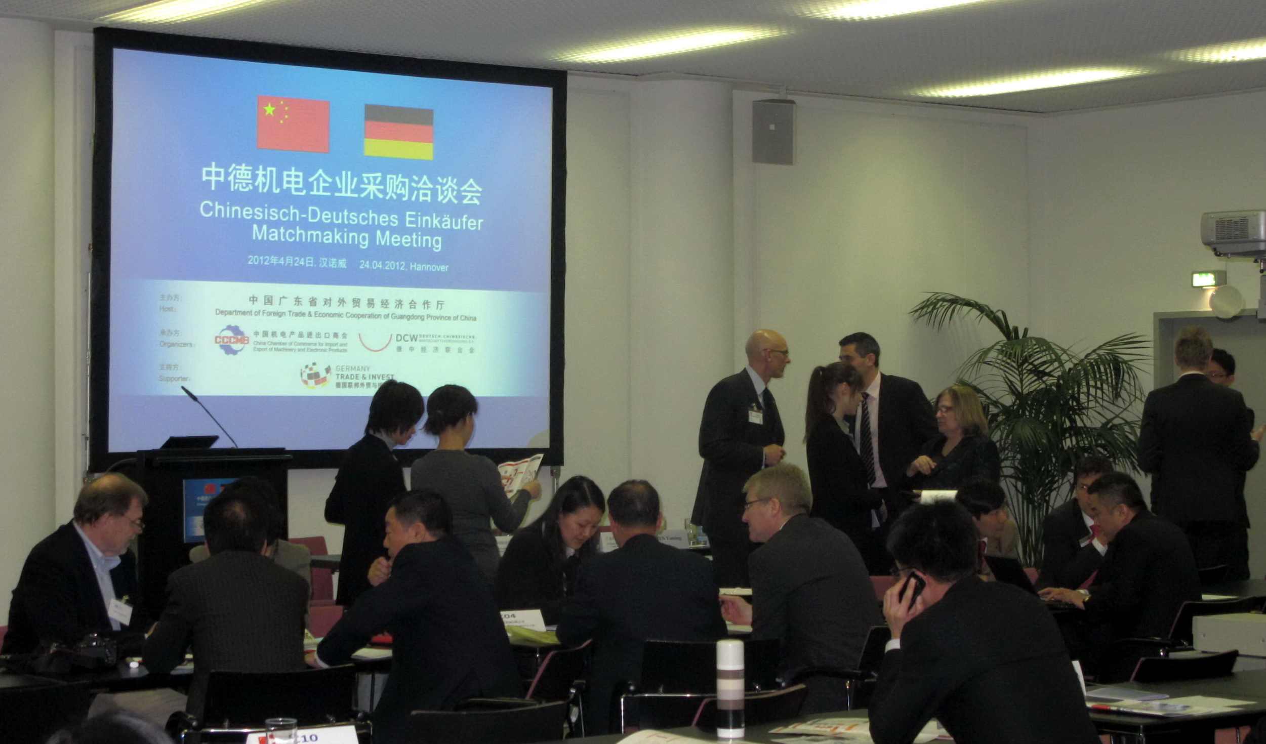 4月24日上午,作为汉诺威博览会“中国年”活动的一部分,由广东省对外经济贸易合作厅主办,我会与德中经济联合会共同承办的中德机电企业采购洽谈会在2012汉诺威工业博览会同期,于德国汉诺威展览中心成功举行。中德企业代表共90余人出席了洽谈会。陈育明副巡视员介绍了广东省与德国的经贸合作情况及采购团企业和采购意向,强调了德国技术和产品的优势,并表达了促成采购团企业与德国先进技术和设备制造商达成合作共识的强烈意愿。中国驻汉堡总领馆经商室裴永贵参赞、德中经济联合会副秘书长凯琳女士、德国联邦外贸与投资署驻华代表韩佩德先生和机械设备行业高级经理马科・科博先生应邀出席洽谈会并致辞,同时介绍了中德合作、德国投资环境和德国机械设备行业等情况。之后,中、德企业进行了两个小时的对口洽谈,40余位德国公司代表与采购团企业进行了60余次洽谈,众多中、德企业达成了合作意向。