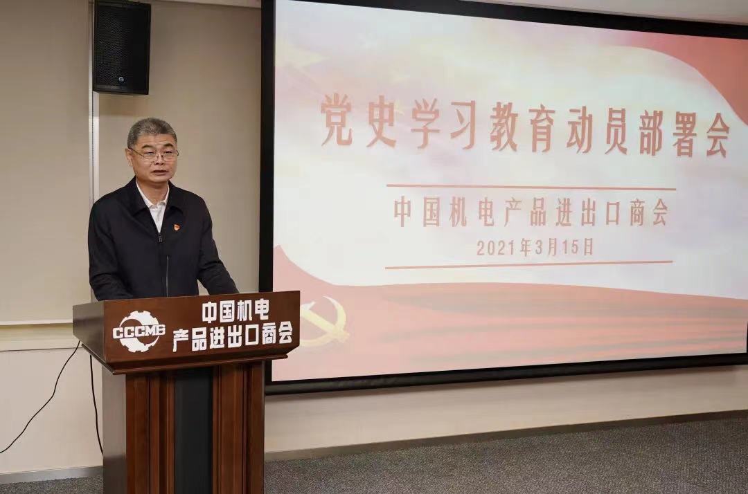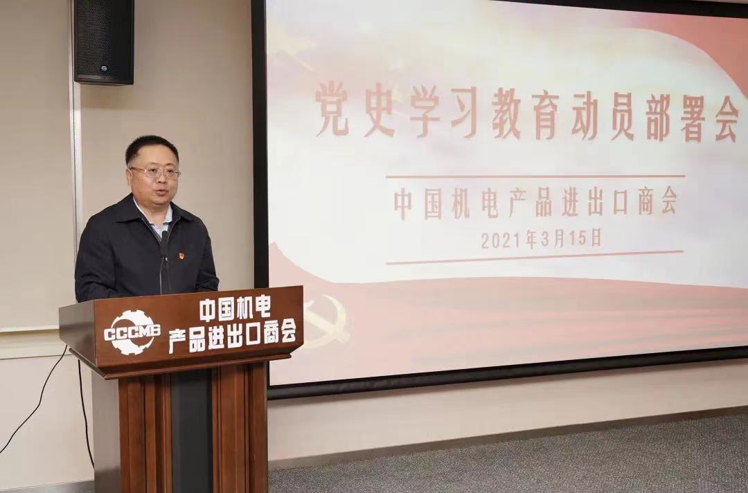3月15日,中国机电产品进出口商会召开党史学习教育动员部署会,贯彻落实中央和国家机关行业协会商会党史学习教育动员部署会精神和有关工作要求,认真学习习近平总书记在党史学习教育动员大会上的重要讲话精神,对机电商会开展党史学习教育进行了动员部署。机电商会全体党员、全体职工,退休老同志代表出席了会议。