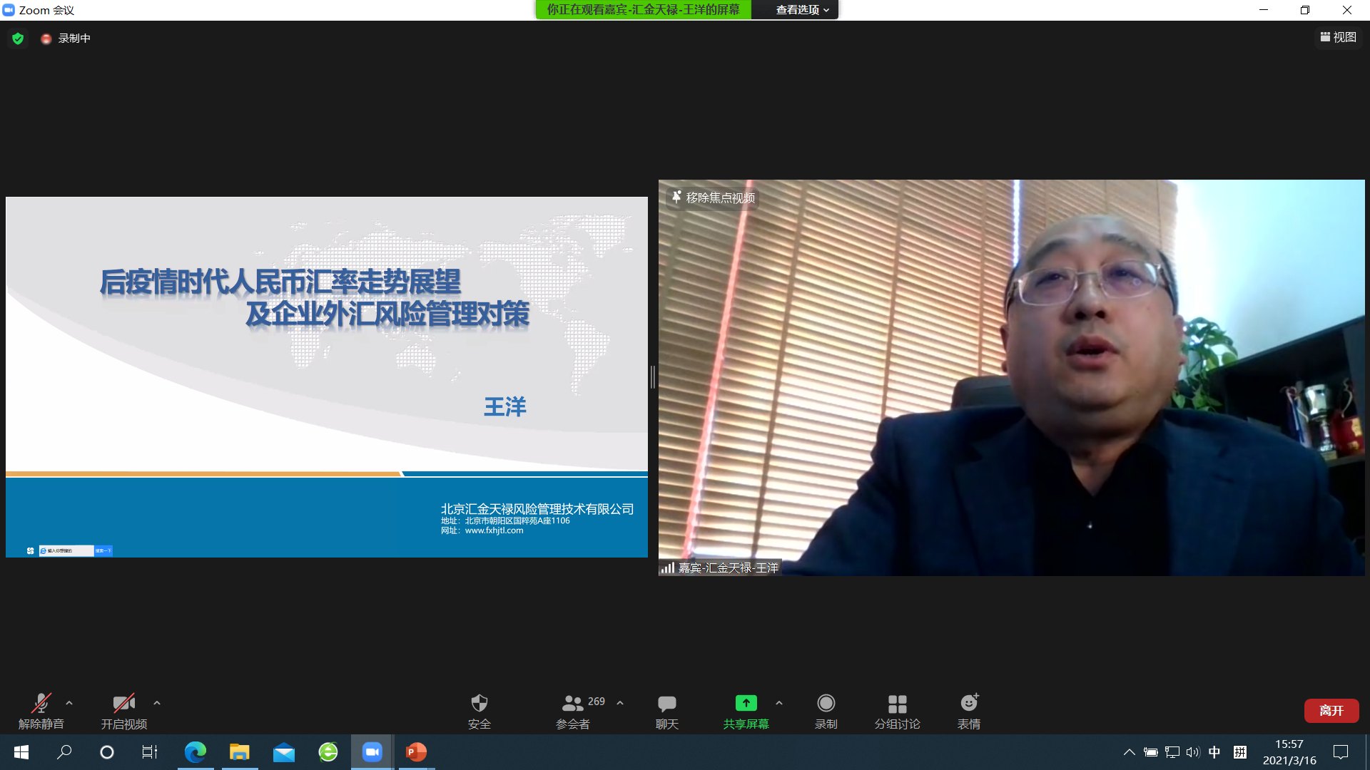 会议邀请中远海运集装箱运输有限公司美洲贸易区总经理戈和悦、天合光能资金与融资总监田宏、汇金天禄风险管理技术有限公司总经理王洋,分别就国际货运市场形势、规避汇率风险经验体会、汇率形势解读及风险应对等话题进行了交流。